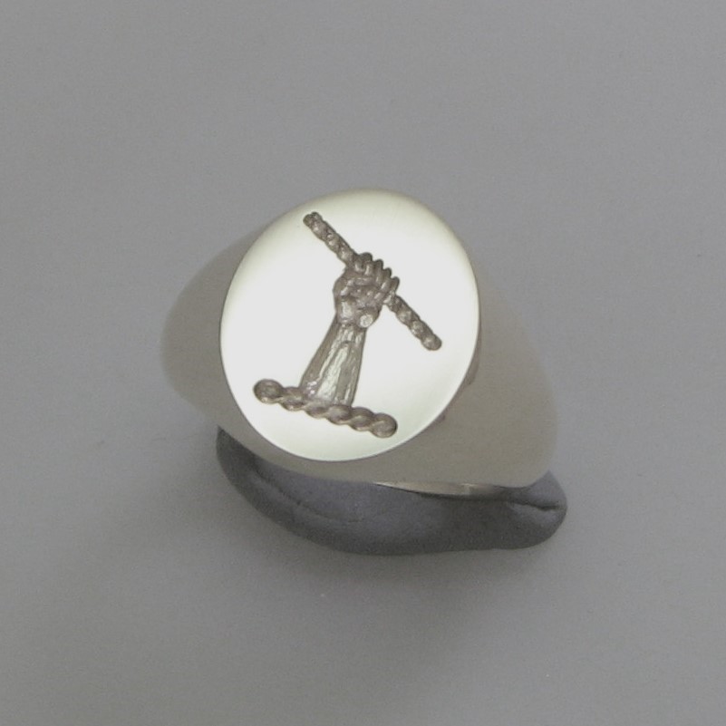 Hand holding scroll crest seal engraved sterling silver 925 signet ring